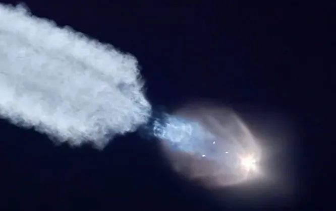 发射时黎明将至,火箭上升过程逐渐脱离地球阴影区。高空尾焰被"自上而下"的阳光照亮反射,最终形成发光"水母"形态。